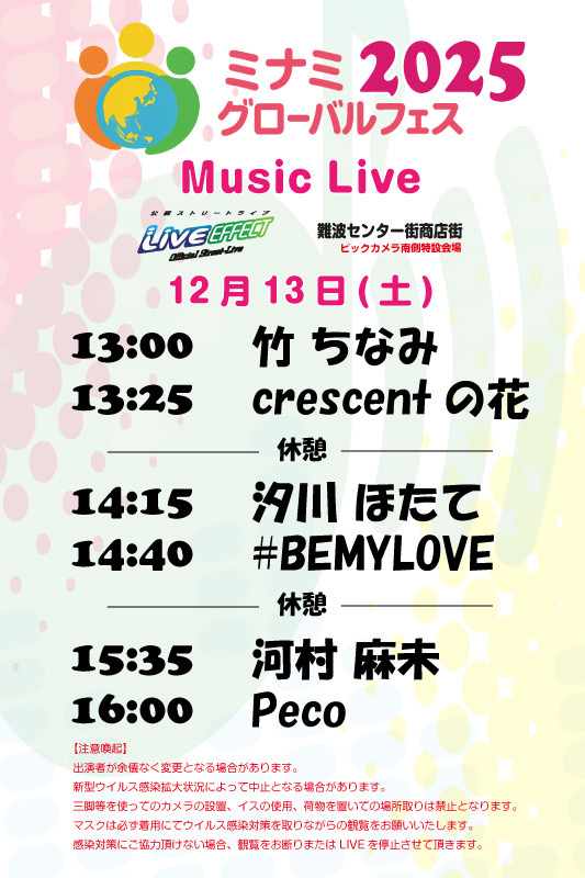 また、同時開催のステージイベント「ミナミグローバルフェス2025」では、アーティストによるライブも実施いたします。